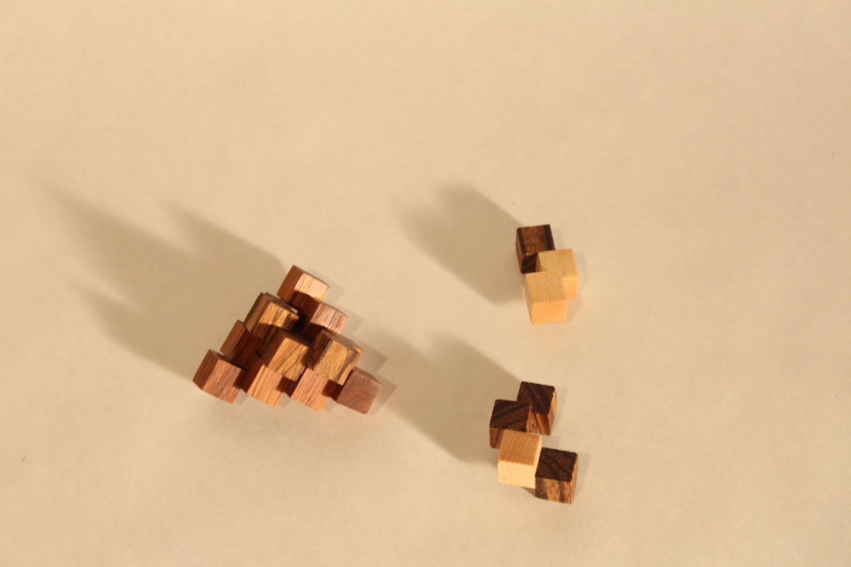 Three-Piece Puzzle Size: 3″ × 3″ × 3″ Materials: Zebra wood, maple, cherry Tools: table saw, 90 degree gluing jig
